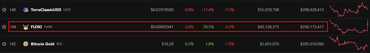 Котировки подражателя Dogecoin, монеты Floki (FLOKI), подскочили еще сильнее — за сутки актив подорожал почти на 40%.