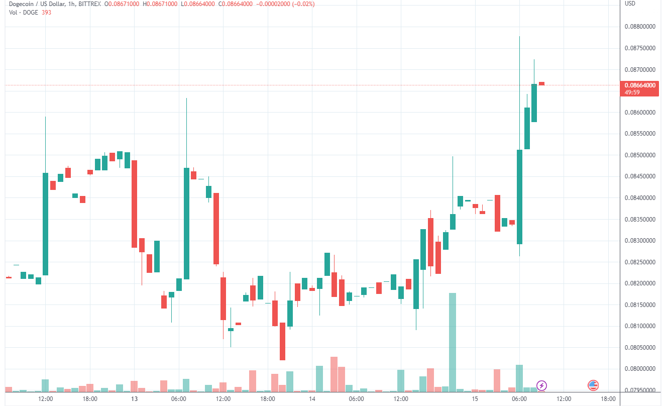Цена мем-криптовалюты Dogecoin (DOGE) отреагировала ростом к отметкам выше $0,087 на серию твитов Илона Маска.