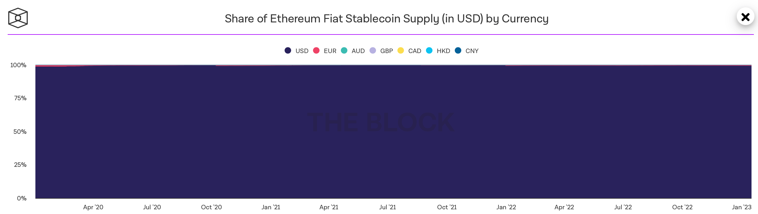 Впрочем, поверить в настолько масштабные изменения за короткий срок достаточно сложно, и дело здесь заключается в невероятном доминировании доллара среди всех стейблкоинов. По данным The Block, на середину января 2023 года доллар служил базовым активом для 99.32 процента всех стейблкоинов в мире. Для сравнения: показатель евро составлял 0.62 процента.