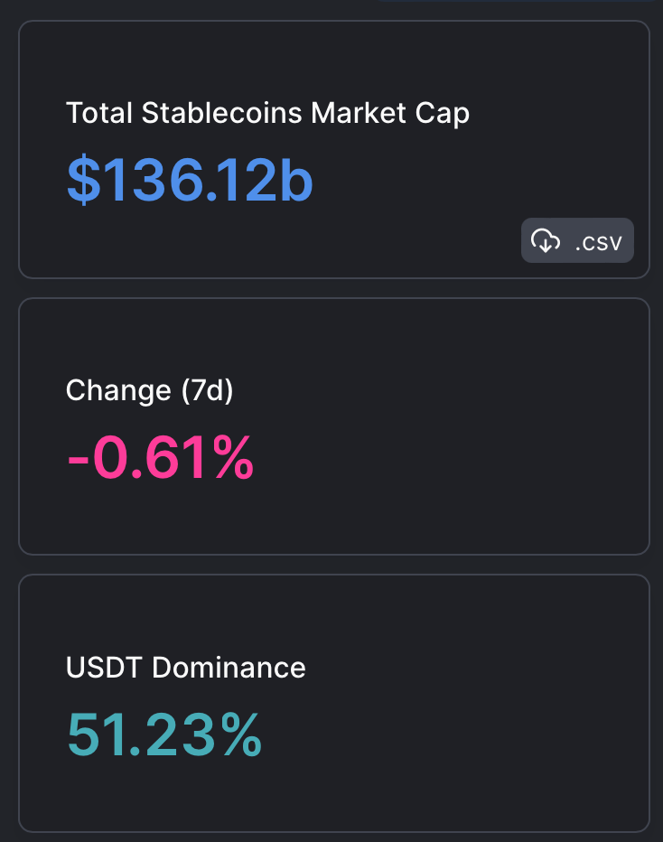 По данным DeFi Llama, доминирование USDT в сфере стейблкоинов достигло 51.23 процента, а весь рынок оценивается в 136.12 миллиарда долларов.