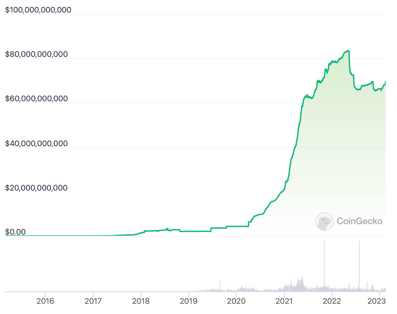 Показатель вырос с 68.47 до 69.23 миллиарда долларов в начале этой недели, сообщает Decrypt. За тот же период времени капитализация BUSD упала с 16.14 до 15.46 миллиарда долларов.