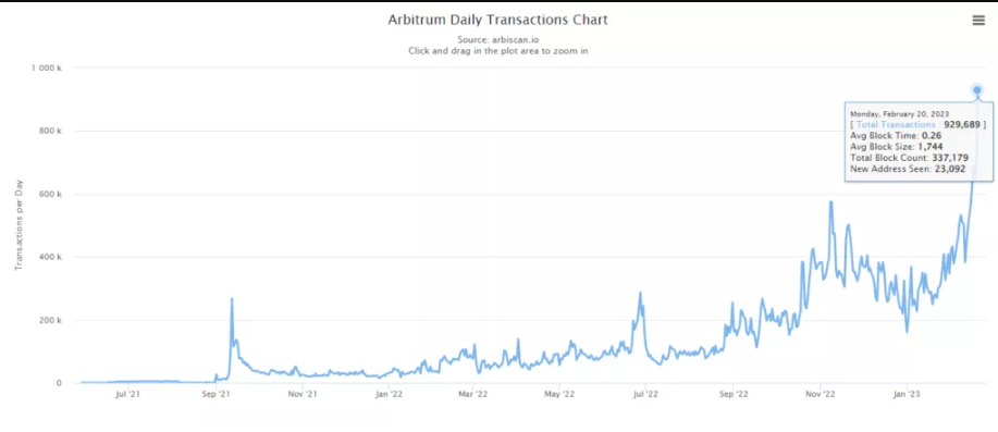 Суточный объем транзакций в сети второго уровня Arbitrum приблизился к рубежу в 1 млн.
