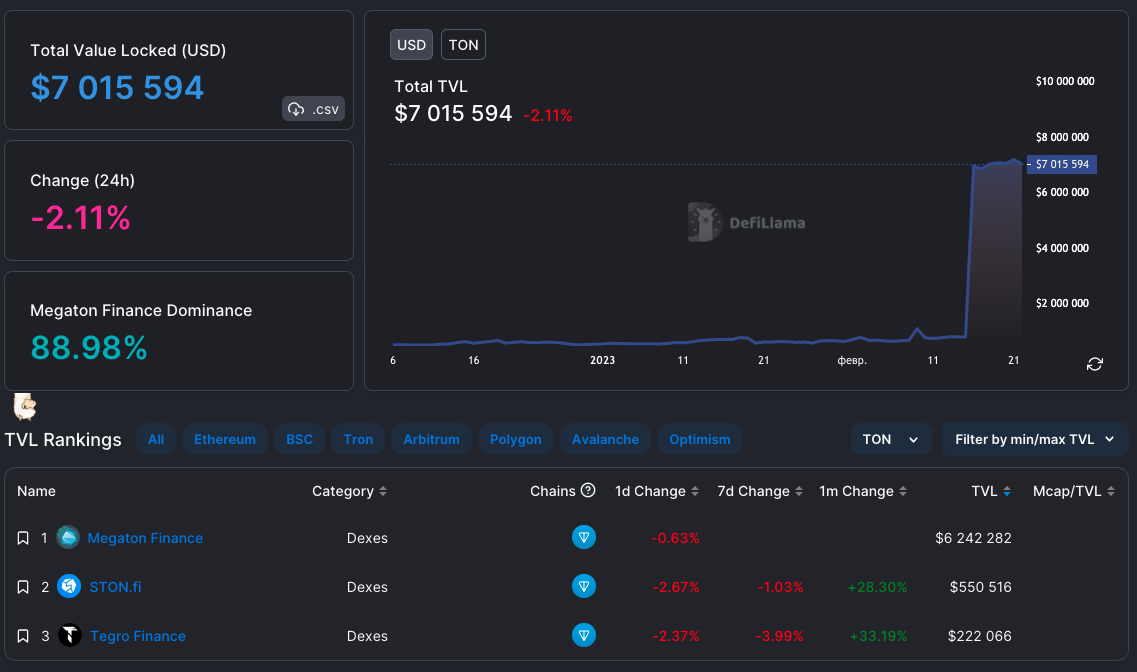 С помощью новой платформы держатели Toncoin смогут участвовать в принятии решений по всем проектам в сети. На момент написания на трех DEX заблокированы токены на сумму $7 млн, по данным DefiLlama.