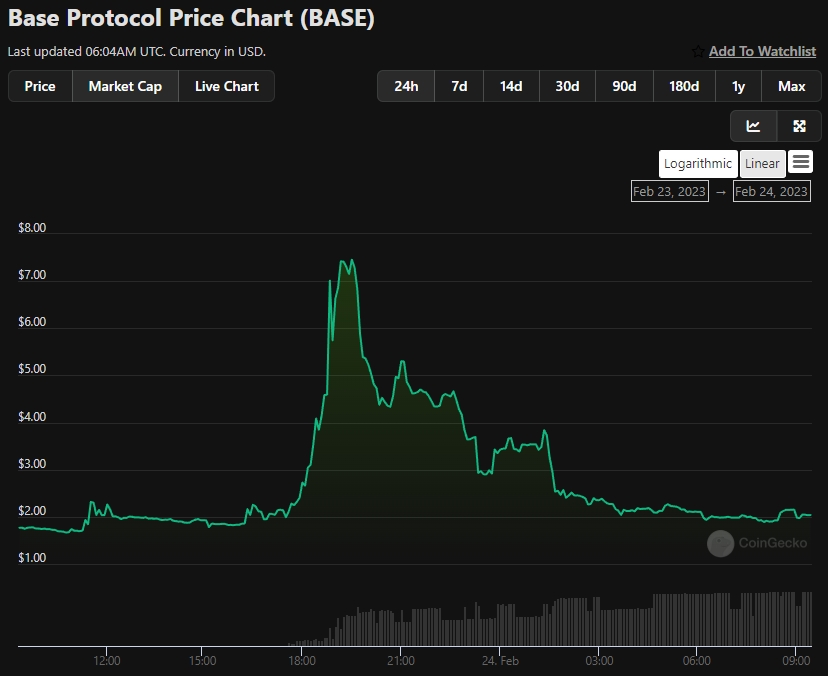 Цена токена Base Protocol (BASE) подскочила с уровней около $2 до максимума в $7,5 после объявления Coinbase о запуске тестовой сети решения второго уровня Base.