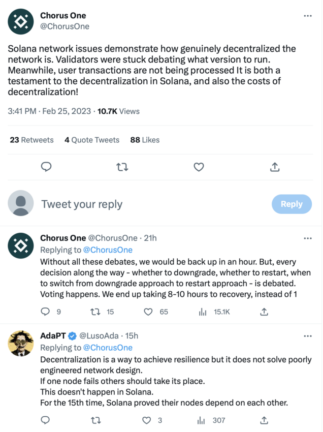 Поставщик инфраструктуры Chorus One попытался представить событие в более позитивном свете. Он написал в «Твиттере», что вчерашнее событие продемонстрировало, насколько децентрализована сеть, и получил массу возмущенных комментариев в ответ. Пользователи отмечали, что децентрализация не решает проблему плохо продуманного дизайна сети, и Solana раз за разом доказывает свою несостоятельность.