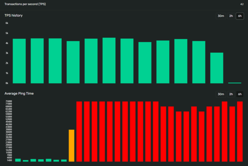 Блокчейн Solana (SOL) перестал подтверждать транзакции пользователей примерно в 6 часов утра по Гринвичу. Согласно данным эксплорера, пропускная способность сети упала с 4 300 до 42 транзакций в секунду (TPS).