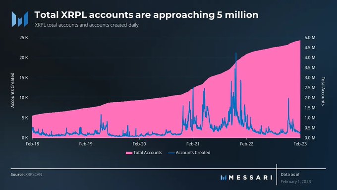 Несмотря на трудности, которые в настоящее время влияют на криптовалютный рынок, криптовалюта XRP от Ripple продолжает расти. 23 февраля общее количество счетов на XRP приблизилось к 5 миллионам.