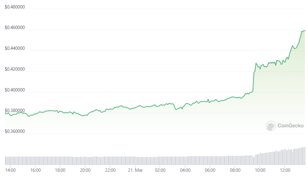 Ралли в паре XRP/USD началось 21 марта, когда цена XRP достигла 90-дневного максимума в $0,459.