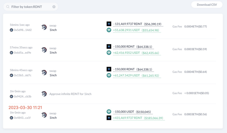 В результате за короткий период времени цена альткоина выросла на 20,5%, благодаря чему трейдер SmartMoney заработал 29,3 тысячи долларов за 5 минут, просто купив и продав RDNT.