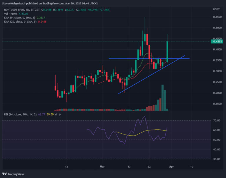 В настоящее время цена RDNT находится в восходящем тренде после того, как за последние 2 недели установила верхние минимумы. Объявление о листинге Binance привело к тому, что цена токена преодолела уровень сопротивления на уровне $ 0,3569.