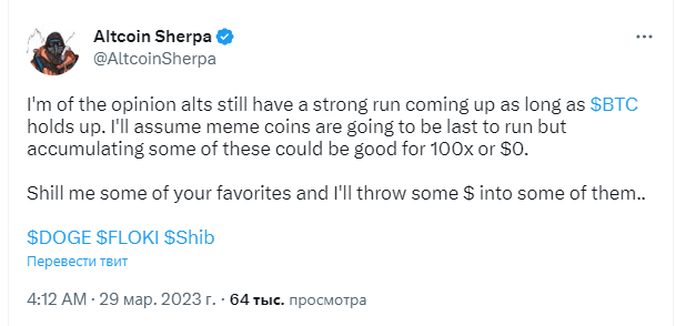 Криптоблогер Altcoin Sherpa написал в Твиттере (компания признана экстремистской и запрещена на территории России), что альткоины мощно растут, пока стабильно растёт BTC. Он полагает, что монеты-мемы будут расти последними, но приобретение некоторых из этих монет может принести прибыль.