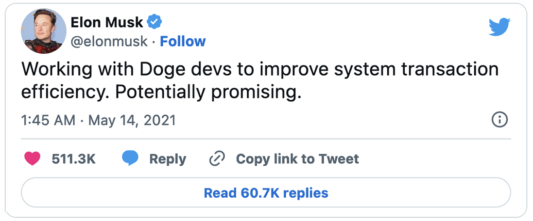 Ее трансформация в надежный финансовый актив произошла во многом благодаря верному поклоннику в лице миллиардера и владельца компаний Tesla и SpaceX, а также соцсети Twitter Илона Маска. Разработчики криптовалюты рассказывали, что сотрудничают с ним еще с 2019 года.