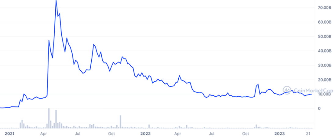 Dogecoin, которая появилась на крипторынке и начала развиваться исключительно за счет хайпа, в настоящий момент уже заняла вполне достойное место на нем. Сейчас она находится на девятом месте по уровню капитализации на рынке среди всех цифровых валют мира с показателем в почти 10 млрд. долларов.