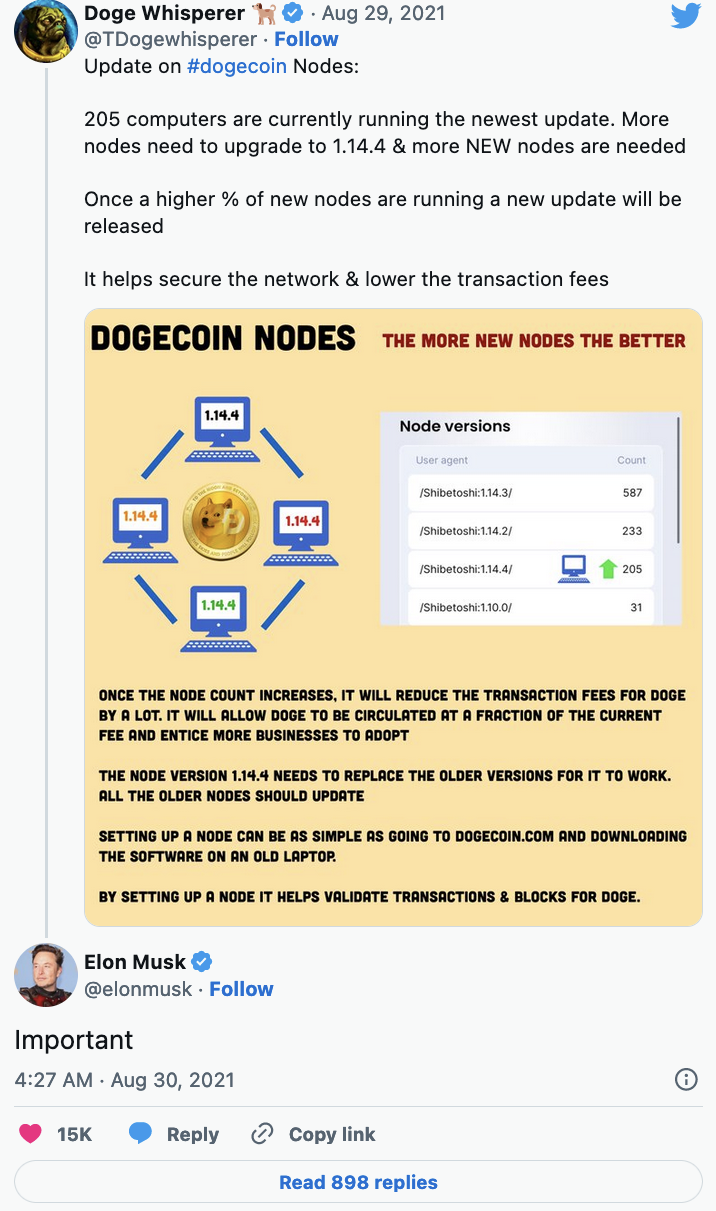 Маск неоднократно разгонял рыночные котировки DOGE своими твитами. Кроме того, он поддерживал обновления сети этой криптовалюты – прежде всего, снижение комиссий за транзакции, размер которых долгое время был предметом недовольства пользователей. Он также призывал распространить сеть Dogecoin на максимальное число компьютеров.