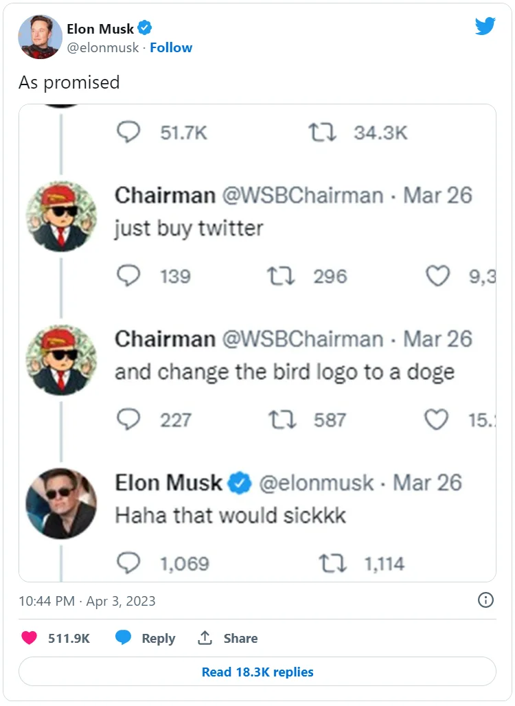 Twitter и DOGE. В марте прошлого года в ходе переписки с Маском трейдер под ником WSBChairman предложил миллиардеру купить Twitter и сменить логотип на изображение DOGE. Тогда Маск отметил, что это было бы «круто», а спустя два месяца купил соцсеть за 44 млрд долларов.