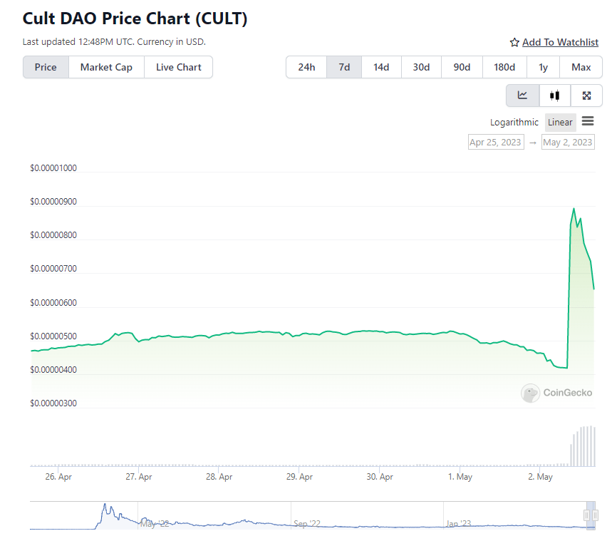 Несмотря на то, что он не объяснил, что стоит за этой фразой, генеральный директор Твиттера вызвал скачок цен на токен CULT более чем на 70%.