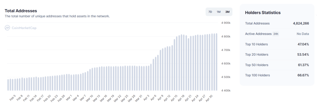 По состоянию на 2 мая в сети было зарегистрировано 4 824 266 уникальных адресов, содержащих Dogecoin, для сравнения 2 февраля этот показатель находился на уровне 4 484 703 кошельков (данные CoinMarketCap).
