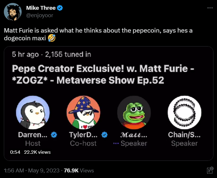 Американский художник Мэтт Фьюри, создавший мемного лягушонка Пепе, до последнего был не в курсе о существовании токена PEPE. Об этом он сообщил в ходе через Twitter Space, посвященной запуску NFT-коллекции Zogs. Когда Фьюри спросили, что он думает о PEPE, то сказал, что «впервые слышит об этом».