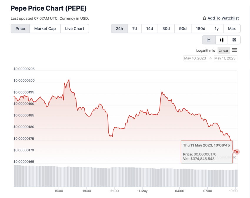 Цена токена отреагировала на новости падением и просела на 2,6% в течение нескольких часов после того, как новость о письме Coinbase распространилась по «Твиттеру». На момент написания PEPE торговался у отметки $0,00000170, снизившись на 12% за последние 24 часа.