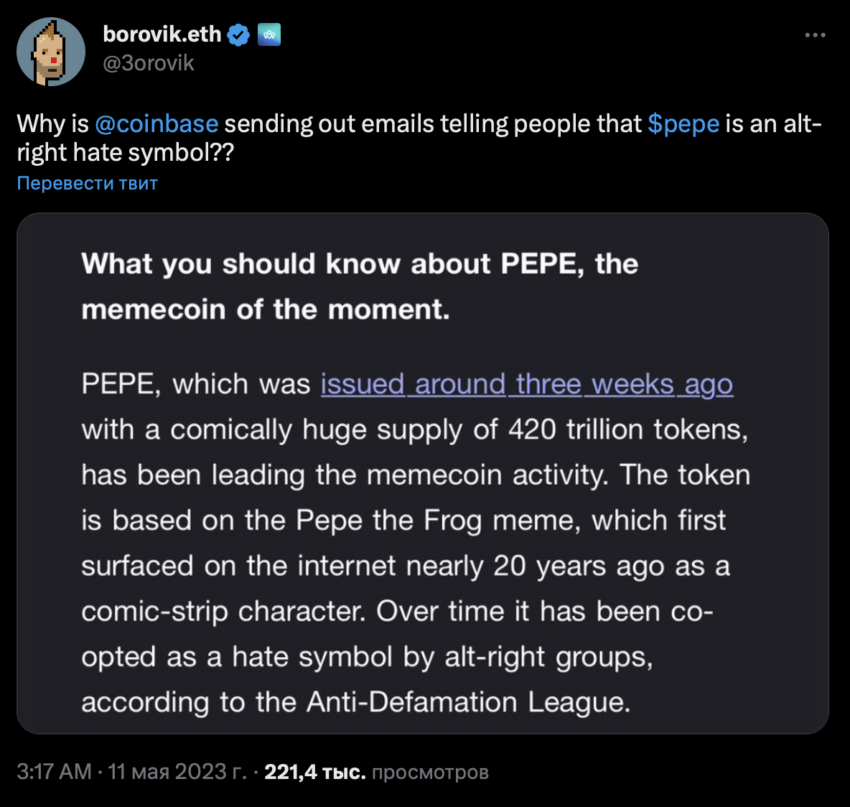 Информационное письмо, разосланное клиентам Coinbase 10 мая, вызвало массу негатива со стороны участников сообщества мемкоина PEPE.
