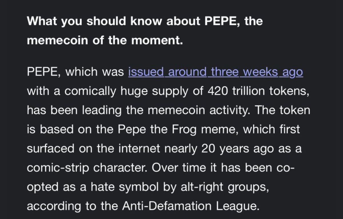 10 мая клиенты Coinbase получили электронные письма, посвящённые PEPE. Представители торговой площадки сообщили пользователям о том, что токены основаны на образе лягушонка по имени Пип, который стал символом ненависти к цветным американцам.