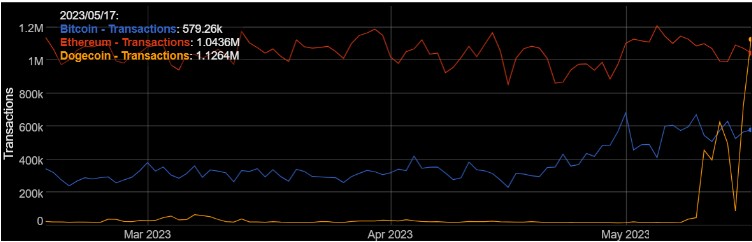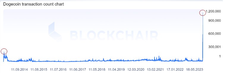 Сейчас, когда догиналы пришли к Doge, количество операций вышло на рекордный уровень. До этого максимальное значение составляло 200 тыс. и было это в 2013 году.