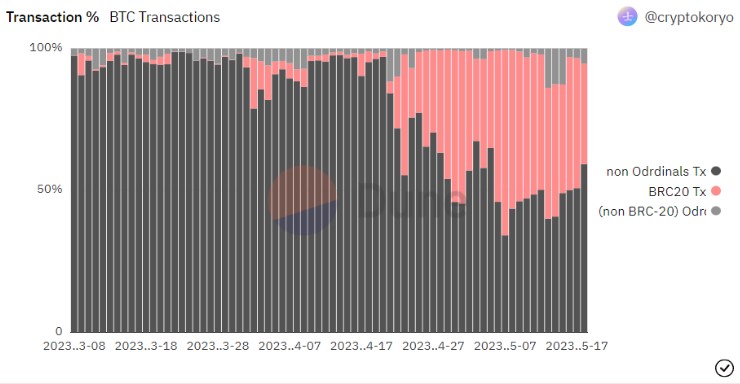Для того чтобы понять, насколько сильно влияние Ordinals, посмотрим на BTC. В некоторых случаях транзакции с новыми элементами достигали 65% от всего объема.