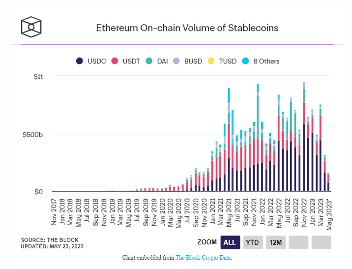 По мнению экспертов, в этом месяце сумма сделок со стейблкоинами на базе ETH окажется самой низкой с декабря 2020 года.
