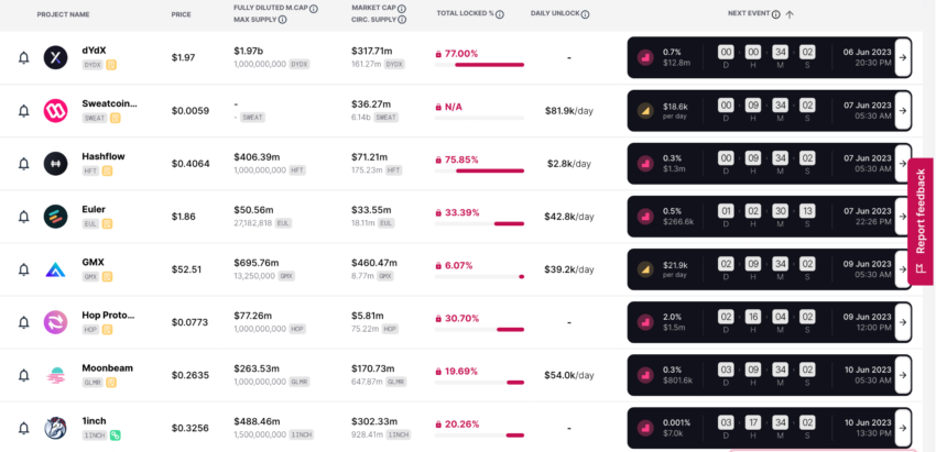Хотя в течение недели будет осуществляться ряд небольших разблокировок, на этом фоне выделяются dYdX, Hashflow и Hop Protocol. Каждый из этих проектов запланировал разлок токенов на сумму не менее $1 млн.