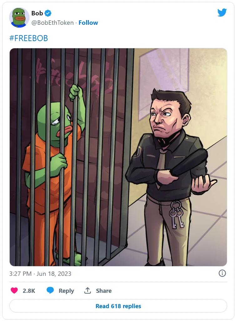 При этом Twitter не принял никаких мер в отношении аккаунта Bob Token. Команда проекта с юмором отреагировала на новость о блокировке бота, поделившись мемом, на котором Маск наблюдает за расстроенным Бобом в тюрьме.