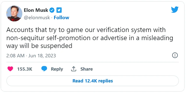 Маск заявил, что Twitter будет блокировать аккаунты, которые «обходят систему верификации и пиарятся или рекламируются вводящим в заблуждение способом».