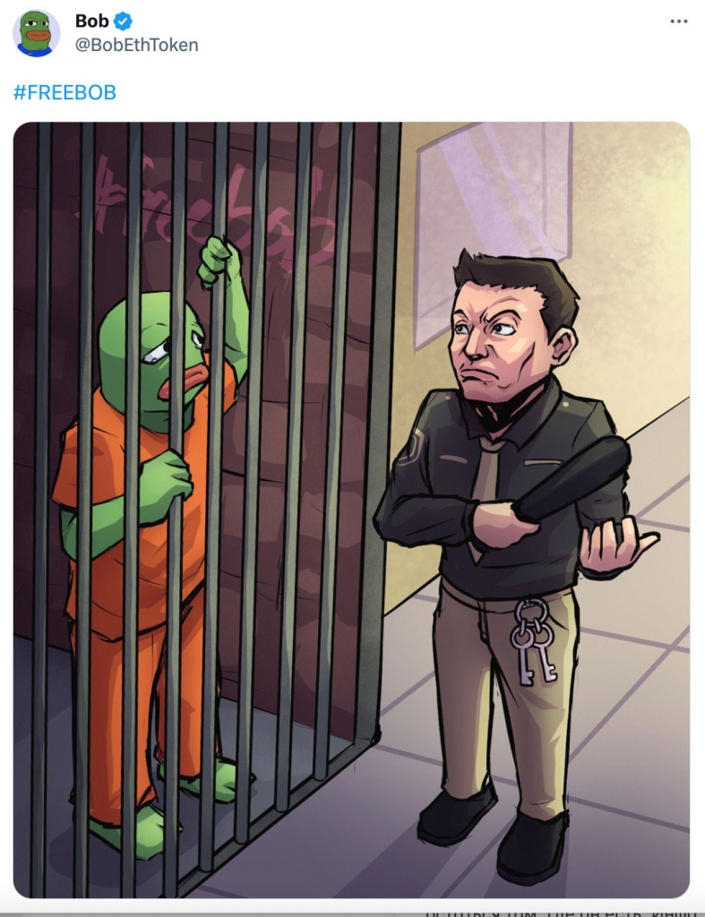 Сразу же после критики и блокировки аккаунта, токен проекта — Bob Token (BOB) — упал в цене более чем на 30%. Однако команда проекта не унывает и уже успела запостить призыв «свободу Бобу» и картинку с символом проекта, сидящем в тюрьме, где в роли охранника выступает сам Илон Маск.