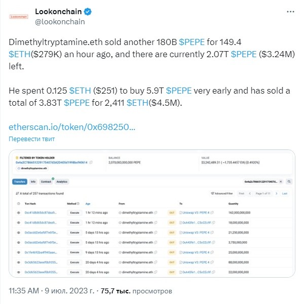 Популярный сервис криптоаналитики Lookonchain сообщил, что криптокит с адресом кошелька Dimethyltryptamine.eth, купивший в общей сложности 5,9 трлн PEPE всего за $ 251 или 0,125 ETH на раннем этапе существования актива, снова распродаёт свои запасы.