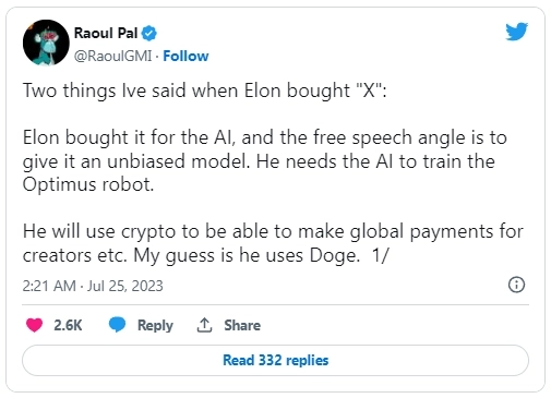 Глава телеканала Real Vision и экс-руководитель банка Goldman Sachs Рауль Пал допустил, что $DOGE будет добавлен в Twitter в качестве платежного средства.
