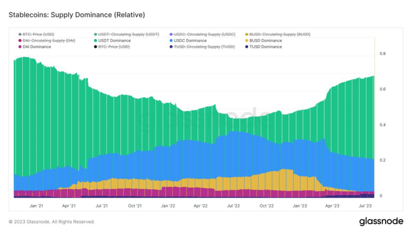 Согласно данным аналитической платформы Glassnode, за прошедший год рыночная капитализация Tether выросла примерно на 30% — на момент написания она составляет $83,8 млрд. Доминирование $USDT на рынке стейблкоинов взлетело до 68,87%.