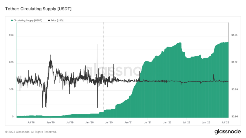 Согласно данным аналитической платформы Glassnode, за прошедший год рыночная капитализация Tether выросла примерно на 30% — на момент написания она составляет $83,8 млрд. Доминирование $USDT на рынке стейблкоинов взлетело до 68,87%.