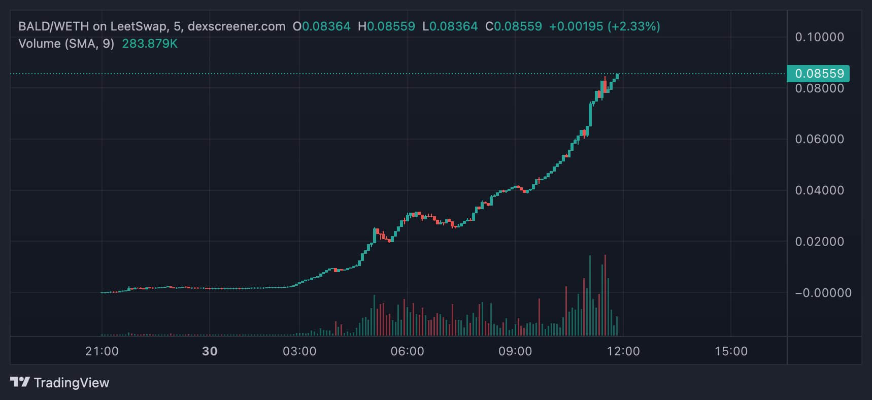 Токен был доступен на децентрализованной бирже LeetSwap и стал хитом последних выходных. Тогда стоимость криптоактива прыгнула на 40 тысяч процентов за 48 часов, при этом за первые сутки торгов его рыночная капитализация выросла с нуля до 50 миллионов долларов. Ситуация на графике BALD выглядела так.