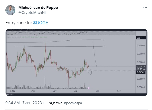 Известный криптовалютный инвестор и аналитик Михаэль ван де Поппе согласился с высказанным мнением и подтвердил, что трейдеры должны присмотреться к инвестициям в $DOGE. По его словам, лучшая зона для входа находится на уровне $ 0,06982.