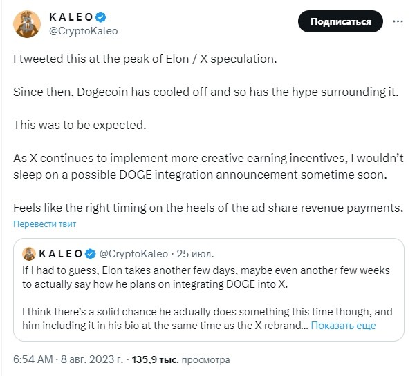 Криптоаналитик Crypto Kaleo считает, что Илон Маск всё-таки планирует интегрировать Dogecoin ($DOGE) в соцсеть X, так как он прорабатывает различные инновационные способы получения дохода.