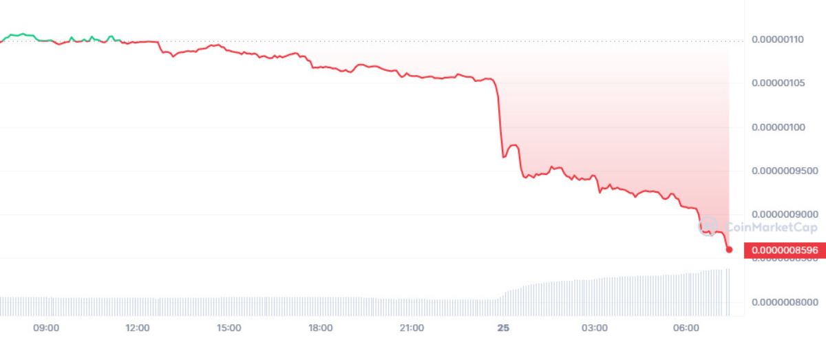 Уровень капитализации Pepe составляет $ 338 млн, соответственно, сбыт принадлежащих разработчикам активов на $ 15,7 млн не обрушит рынок. Однако паническая продажа монет трейдерами уже спровоцировала мощный дамп, в результате которого курс PEPE рухнул на 21% и продолжает лететь в тартарары.
