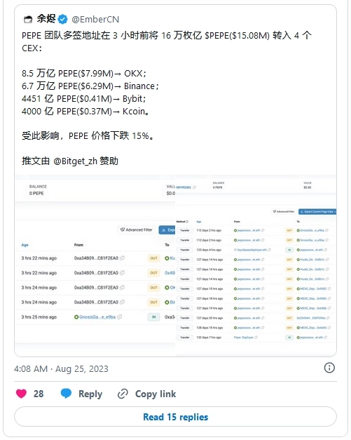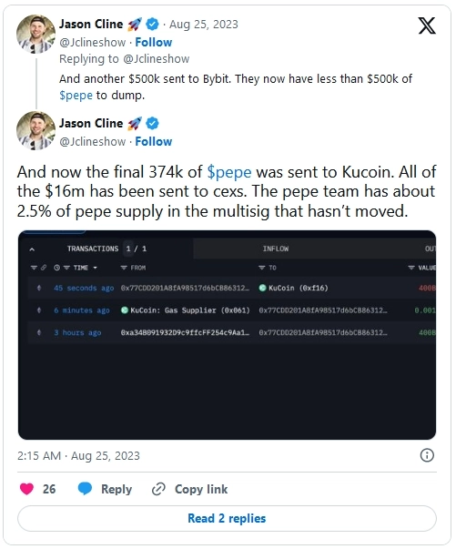 После того, как разработчики начали перемещать PEPE на CEX, актив также продал один из ранних инвесторов. Как пишет аналитик EmberCN, пользователь купил 2,43 трлн монет за $60 в апреле текущего года, с мая по июль он в несколько транзакций продал 554,7 млрд PEPE на $670 000, а 25 августа продал оставшиеся 1,88 трлн монет с прибылью в 1,67 млн долларов. Таким образом, за 4 месяца его вложения подорожали на 3899900%, принеся прибыль в 2,34 млн долларов.