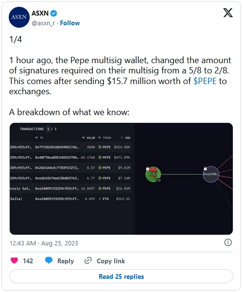 Что еще известно? По данным SafeGlobal, на кошельке разработчиков все еще остается 10,697 трлн PEPE стоимостью свыше 9,3 млн долларов. При этом, как сообщили эксперты аналитической компании ASXN, команда проекта снизила количество необходимых подтверждений в кошельке с мультиподписью с 5 до 2 (из 8 возможных). Примечательно, что ранее средства с него не отправлялись на CEX.
