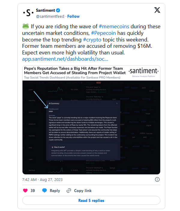 27 августа специалисты аналитической платформы Santiment отметили, что PEPE стал самой обсуждаемой темой в криптопространстве. Они заявили, что ожидают более высокой волатильности, чем обычно.
