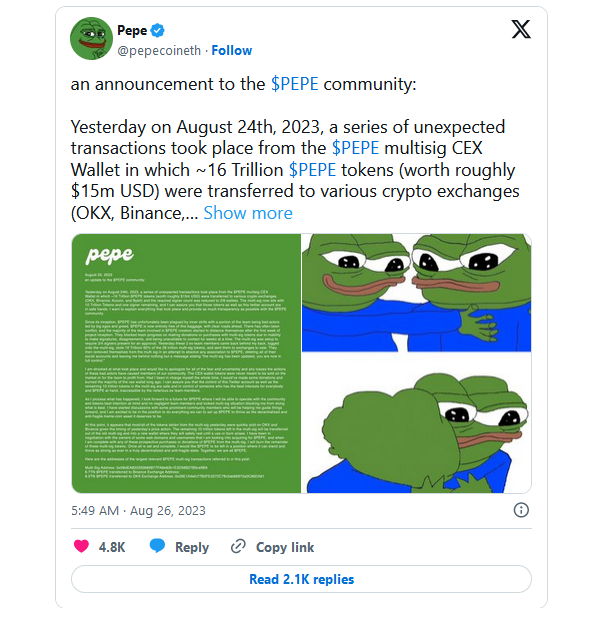Что произошло? Оставшийся разработчик из команды мем-токена PEPE заявил, что его недобросовестные коллеги вывели из кошелька проекта с мультиподписью 16 трлн монет стоимостью 15 млн долларов на централизованные биржи (CEX), включая Binance, OKX, KuCoin и Bybit, сократив количество необходимых подписей до 2/8. Он заверил пользователей, что в настоящий момент оставшиеся на кошельке 10 трлн токенов и соцсети проекта находятся в безопасности под его единоличным контролем.
