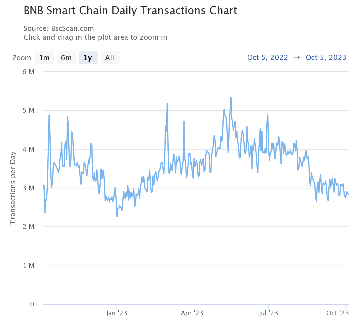 Активность $BNB-адресов снижается с начала сентября. Среднесуточное число транзакций на блокчейне Binance Chain снизилось до 2,745 млн. Об этом свидетельствуют данные сервиса BSCScan.