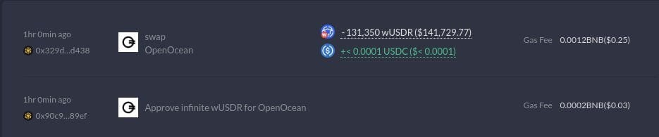 Для этого трейдер воспользовался децентрализованной биржей OpenOcean на основе сети BNB Chain. Ради больших шансов на проведение операции в ходе сделки по обмену USDR на $USDC был установлен слиппедж в слишком большом размере. В результате этого из-за недостатка ликвидности обмен прошёл по крайне невыгодному курсу, что закончилось потерей всех денег.