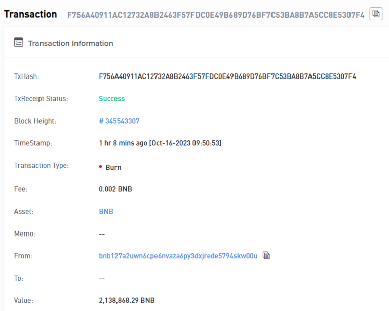 Binance провела ежеквартальное сжигание токенов $BNB – ликвидировано 2 138 868 монет на сумму в 456 миллионов долларов.