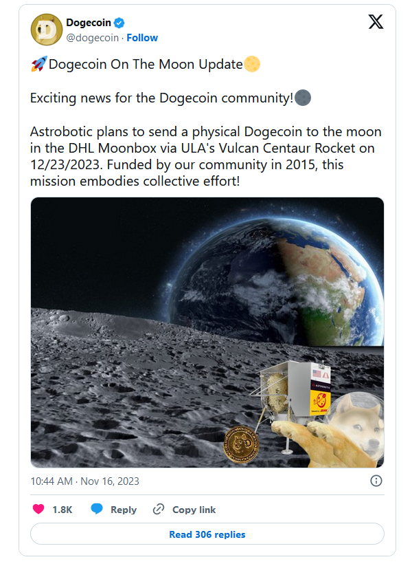 Что произошло? Разработчики Dogecoin (DOGE) отправят кошелек с мем-токенами на Луну. Устройство станет частью груза ракеты Vulcan Centaur от компании United Launch Alliance, основной целью запуска которой является доставка частного лунного модуля Peregrine, созданного Astrobotic Technology. На фоне этой новости курс DOGE прибавил 10% за сутки и в моменте преодолел отметку $0,8, поднявшись до максимума с августа.