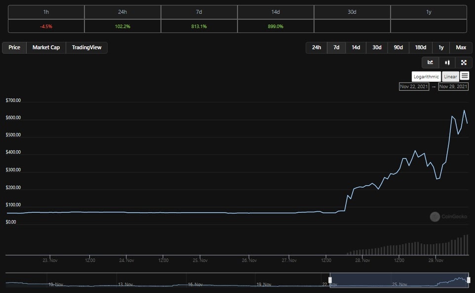 27 ноября Omicron (OMIC) торговался на уровнях около $65, а уже через два дня цена достигла исторического максимума на отметке $689,12.