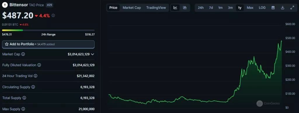 По данным сайта Bittensor, протокол насчитывает более 69 000 активных аккаунтов. Выпущено 5,8 млн токенов TAO (CoinGecko указывает 6,2 млн), эмиссия которых ограничена 21 млн.